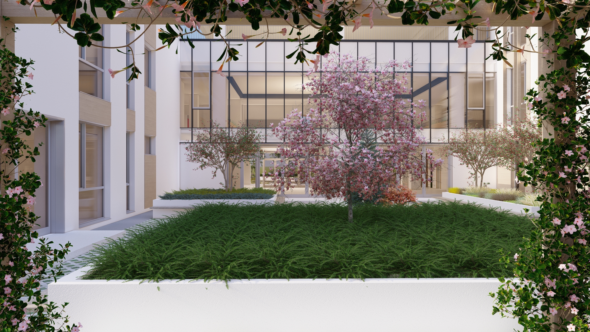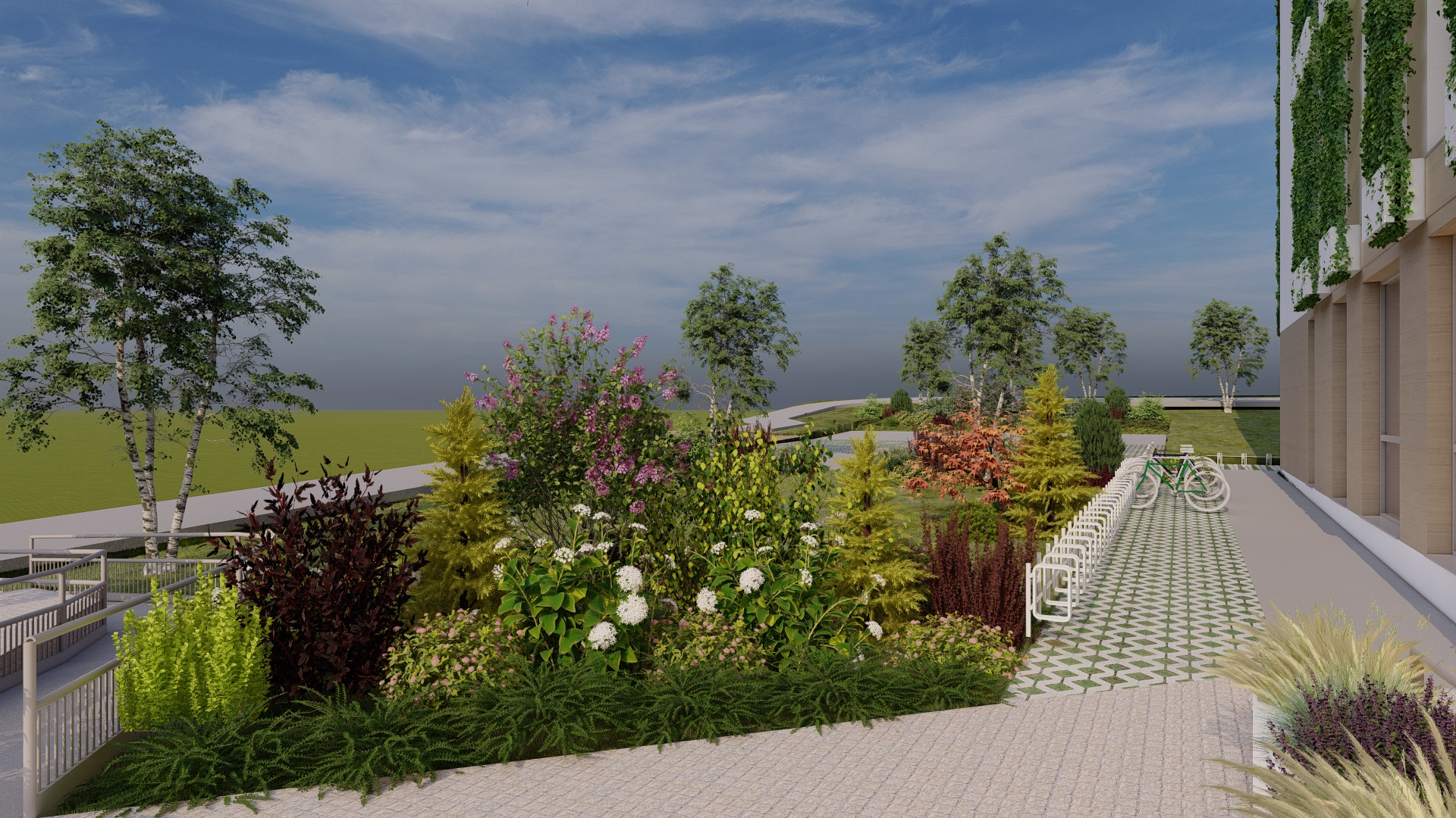 Amenajarea include alei permeabile, zone verzi plantate cu arbori, arbuști și plante perene, spații de stat și socializare din lemn, precum și insule vegetale care îmbunătățesc microclimatul și biodiversitatea. Compoziția urmărește un echilibru între funcționalitate, estetică și sustenabilitate, oferind elevilor un cadru plăcut pentru pauze, activități în aer liber și învățare non-formală.