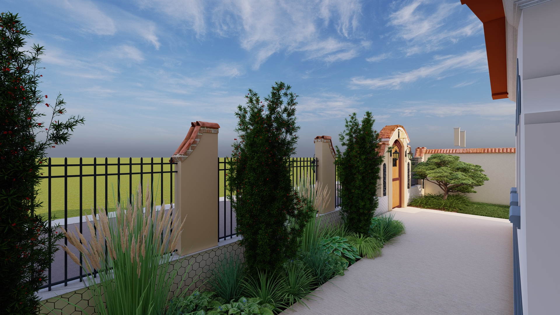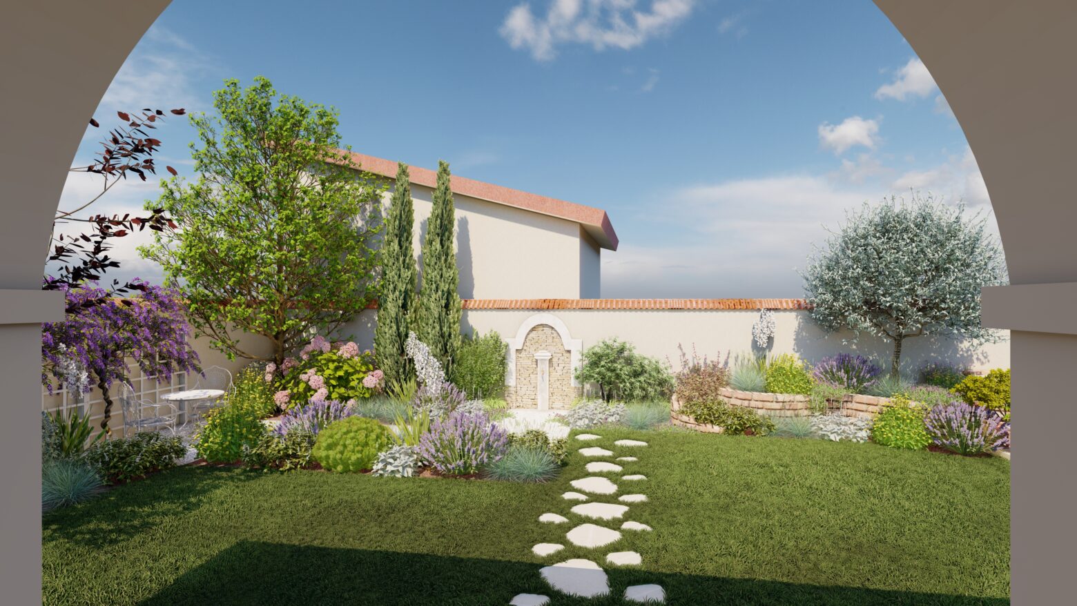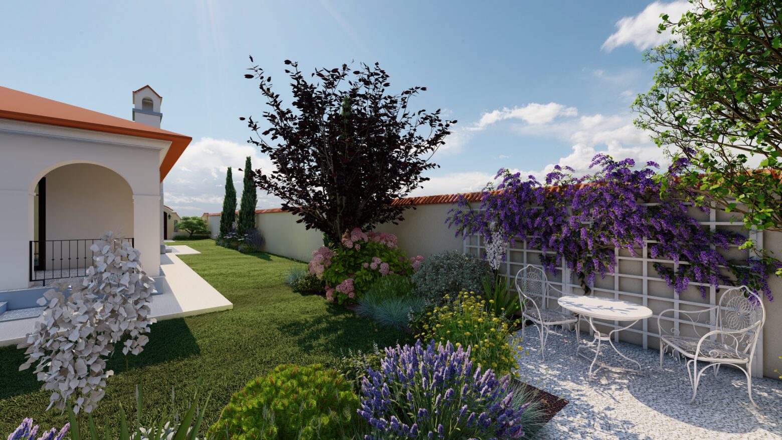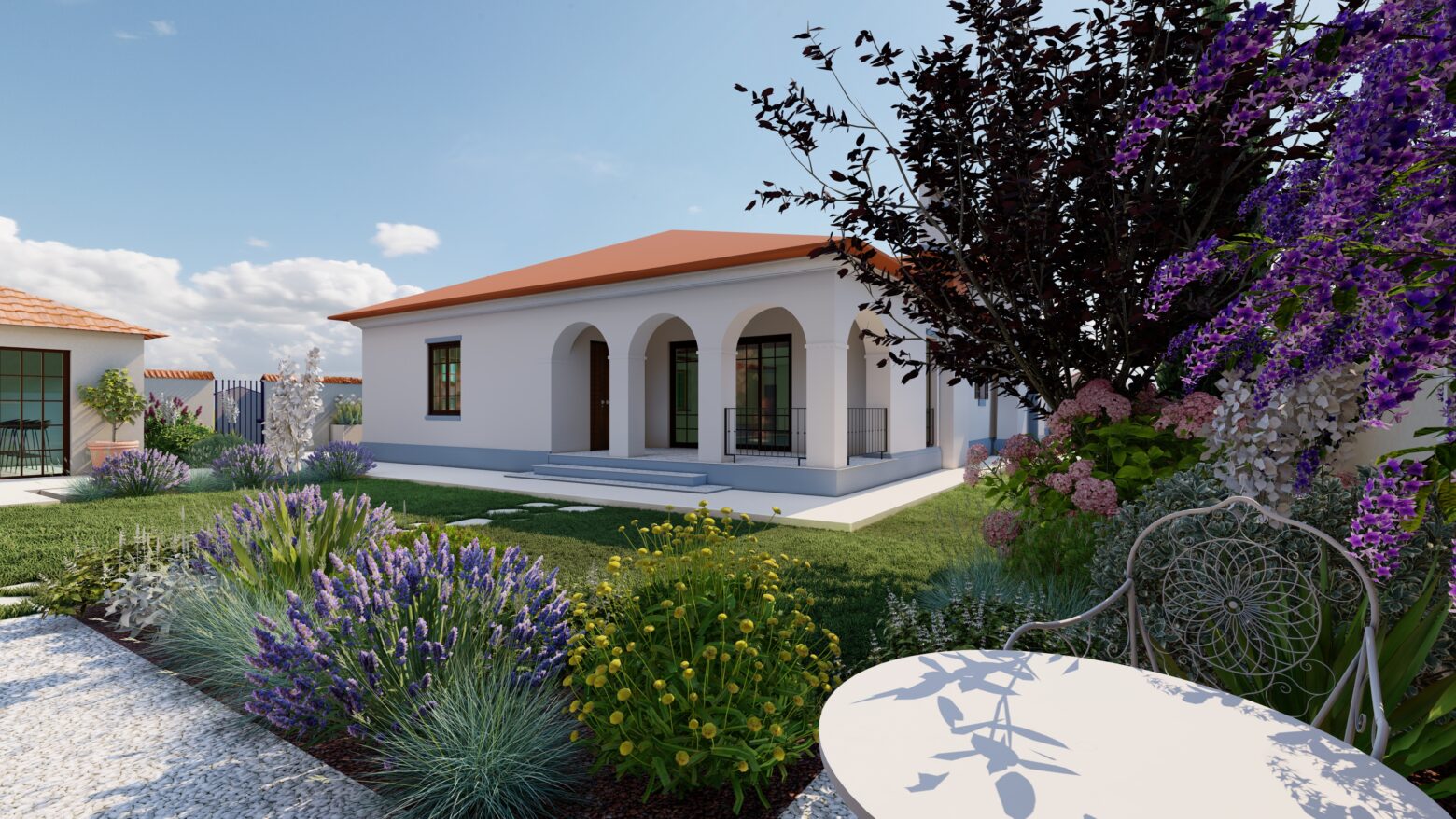 În această grădină, inspirația spaniolă prinde viață într-un spațiu creat pentru tihnă, lumină și bucuria de a trăi în aer liber. Vegetația în stil mediteranean, cu nuanțe argintii, arome calde și siluete elegante, înconjoară casa ca o îmbrățișare, aducând atmosfera sudului chiar în curtea proprie.