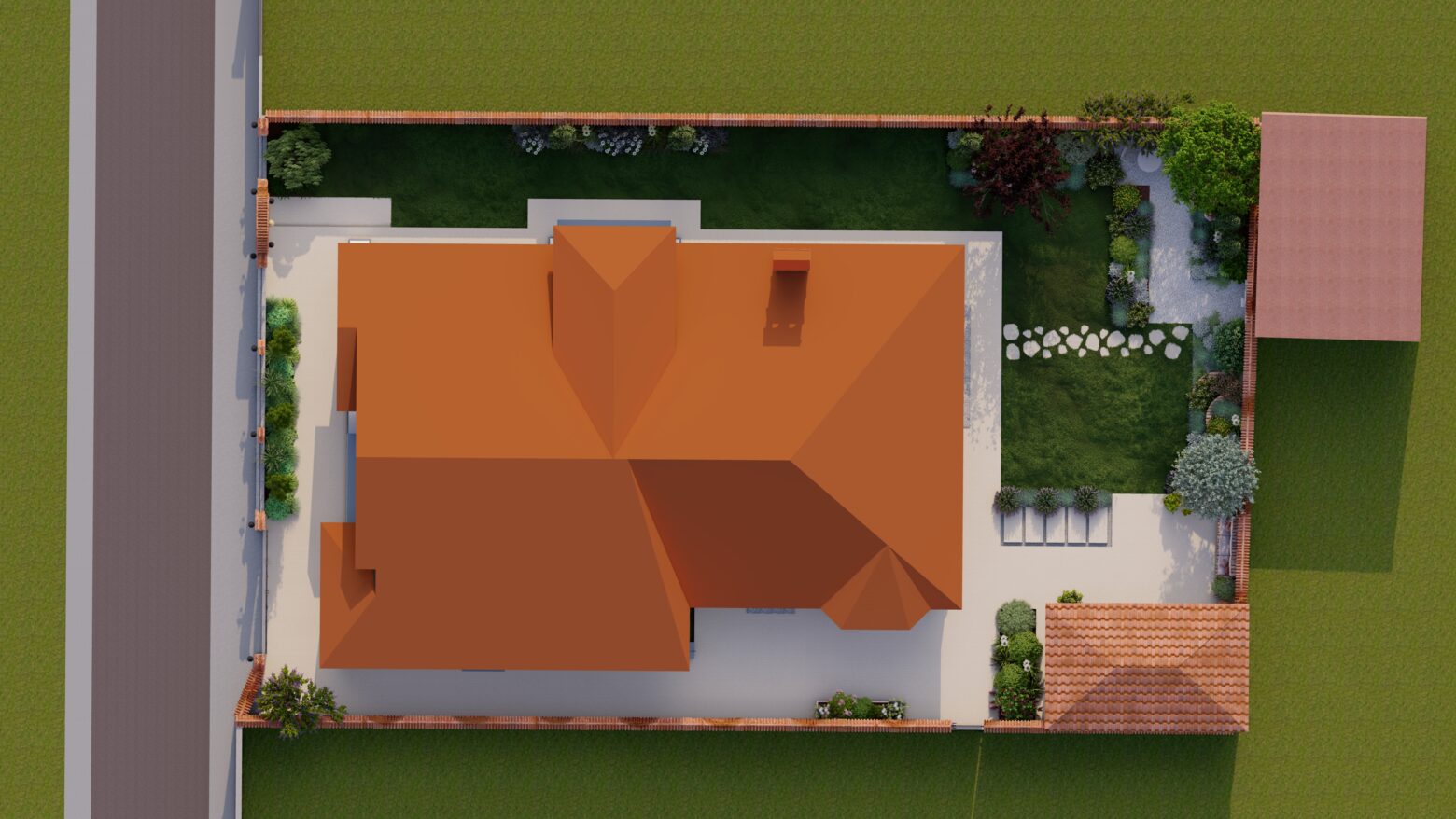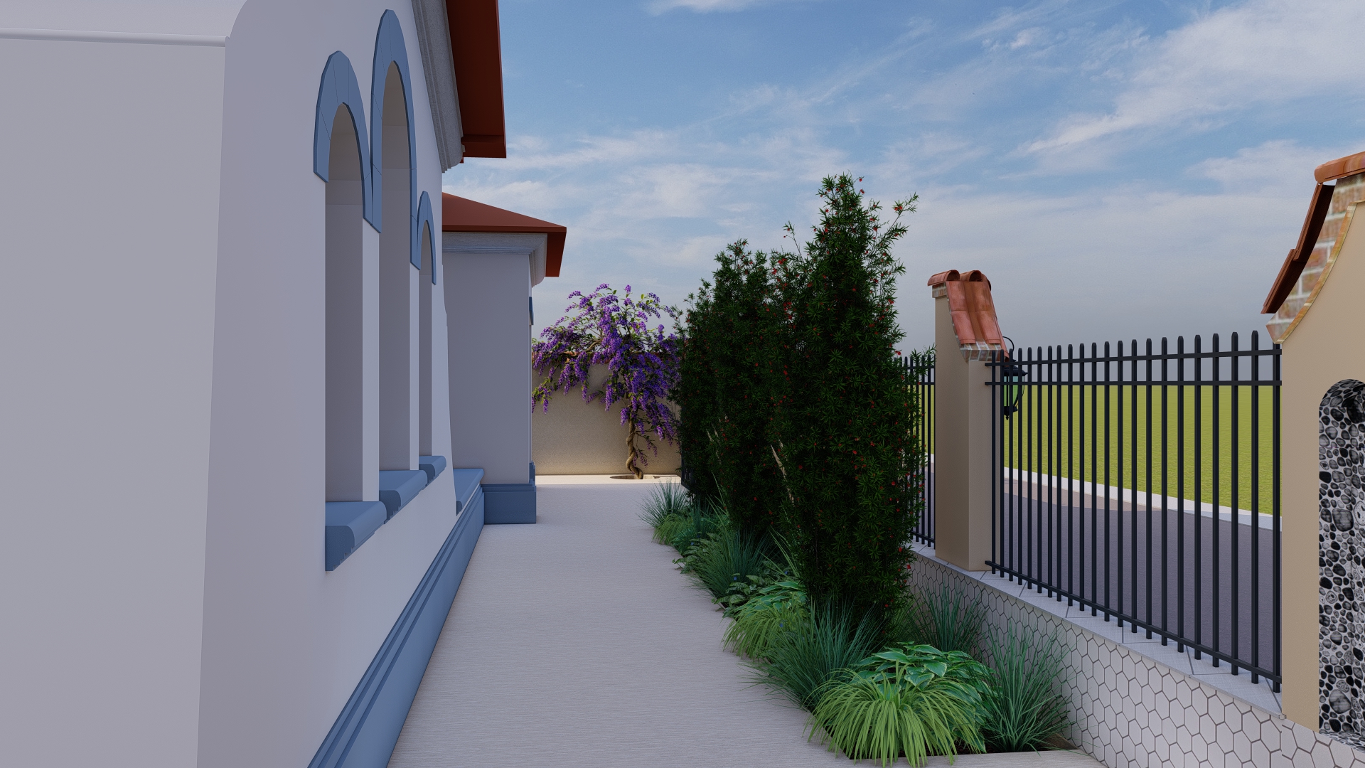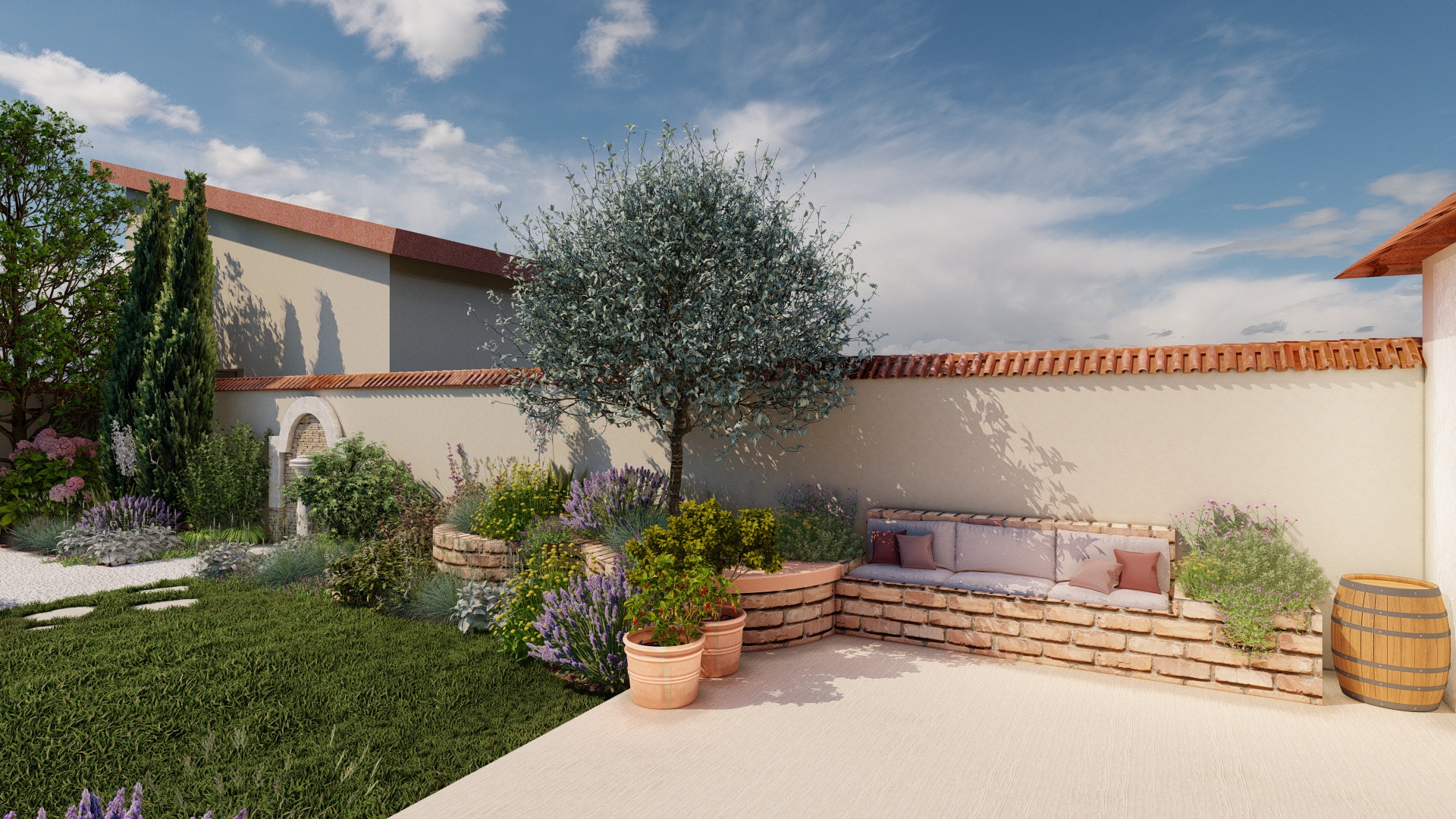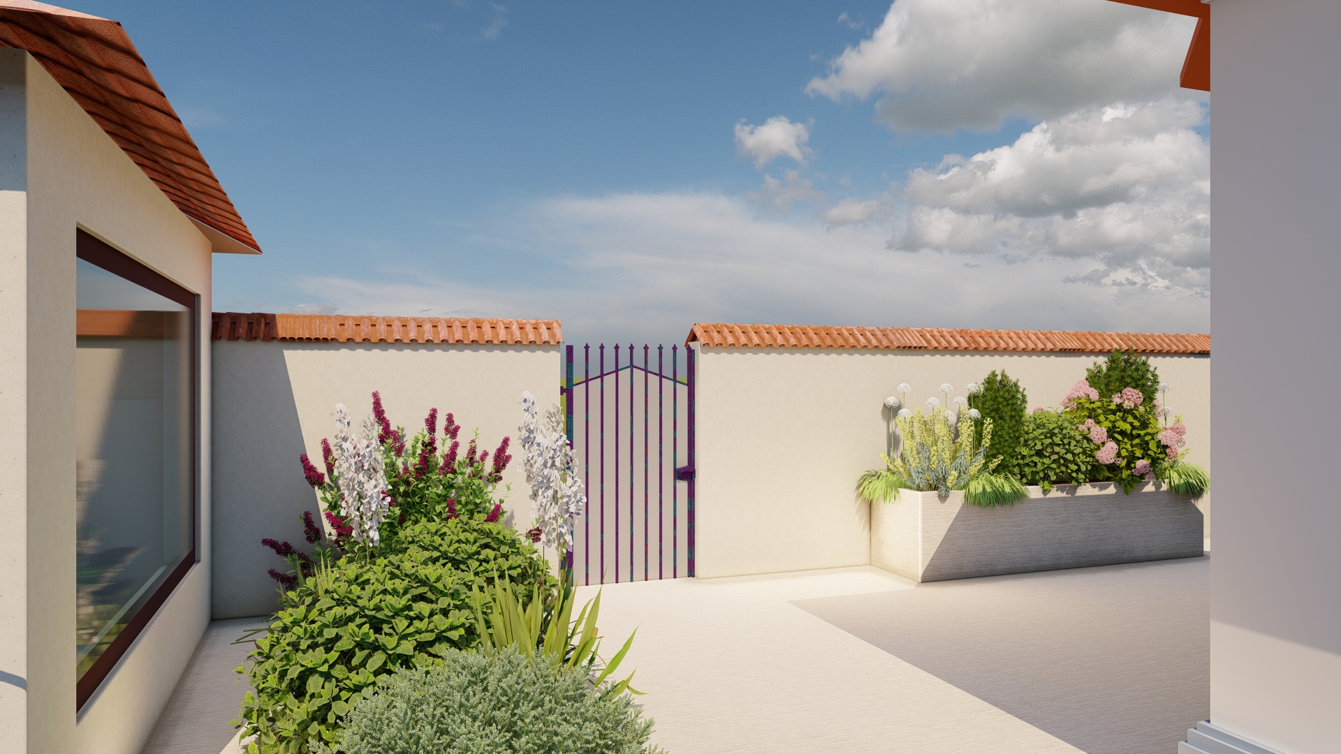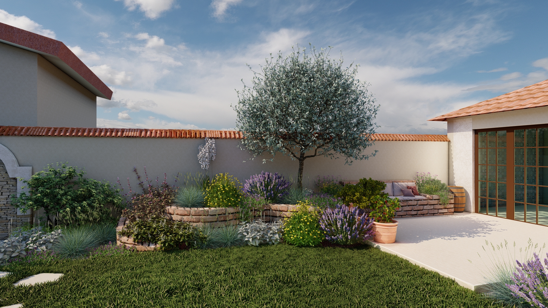 În această grădină, inspirația spaniolă prinde viață într-un spațiu creat pentru tihnă, lumină și bucuria de a trăi în aer liber. Vegetația în stil mediteranean, cu nuanțe argintii, arome calde și siluete elegante, înconjoară casa ca o îmbrățișare, aducând atmosfera sudului chiar în curtea proprie.