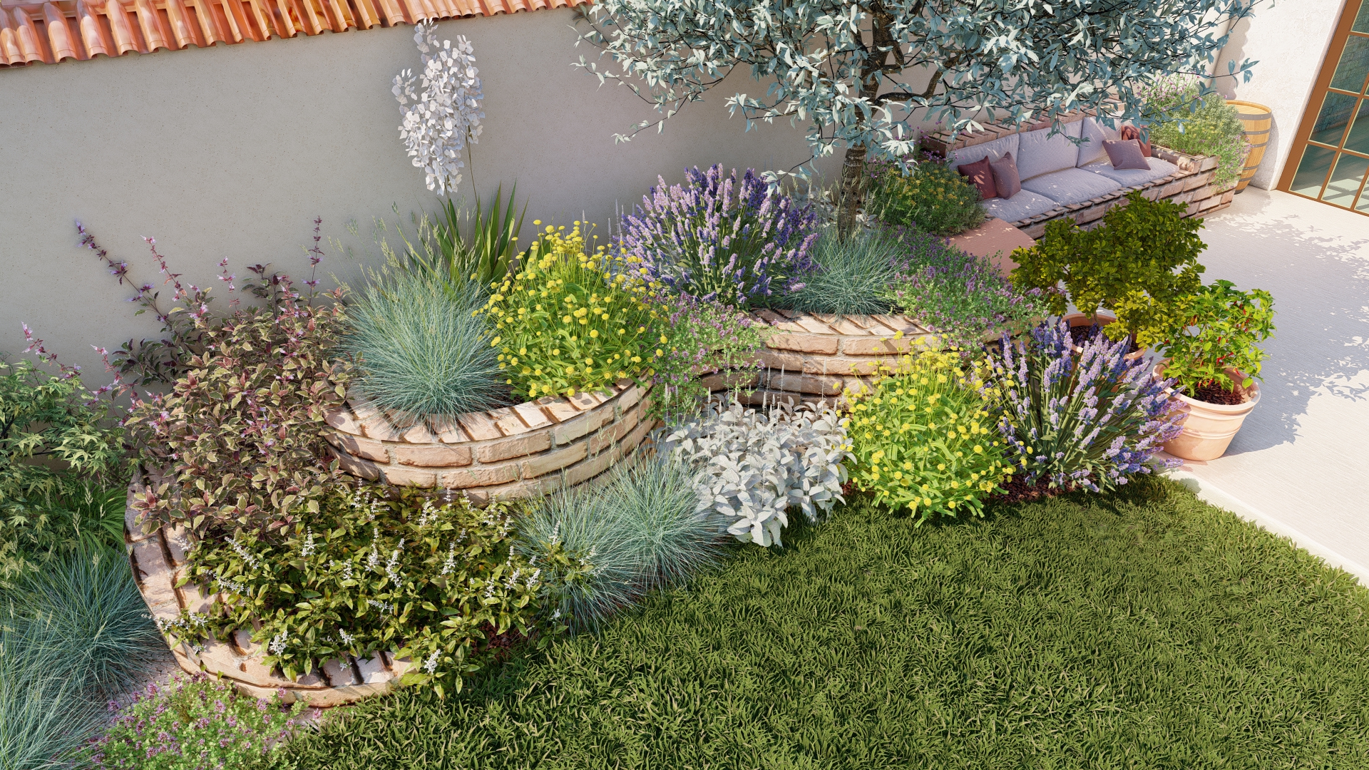 Materialele naturale — piatra, ceramica și cărămida — spun povestea locurilor însorite, unde timpul curge mai încet. Grădina aromatică înălțată devine un mic colț de inspirație zilnică, de unde pot fi culese arome pentru delicii culinare. Iar spațiul de odihnă din cărămidă, inspirat de patio-urile spaniole, invită la cafeaua de dimineață, la seri liniștite și la conversații sub cerul liber.