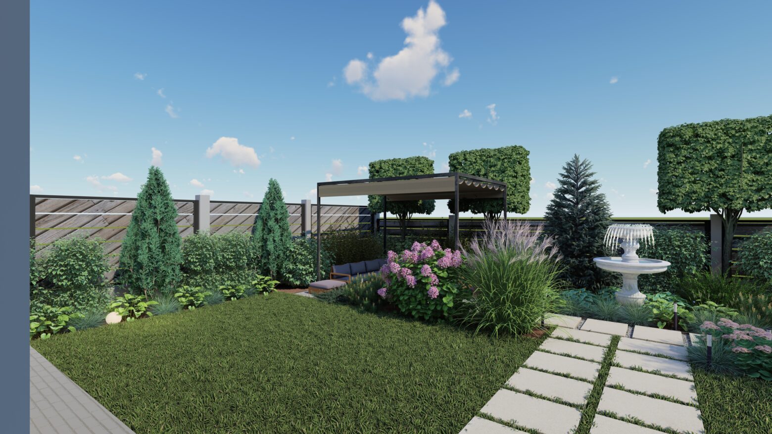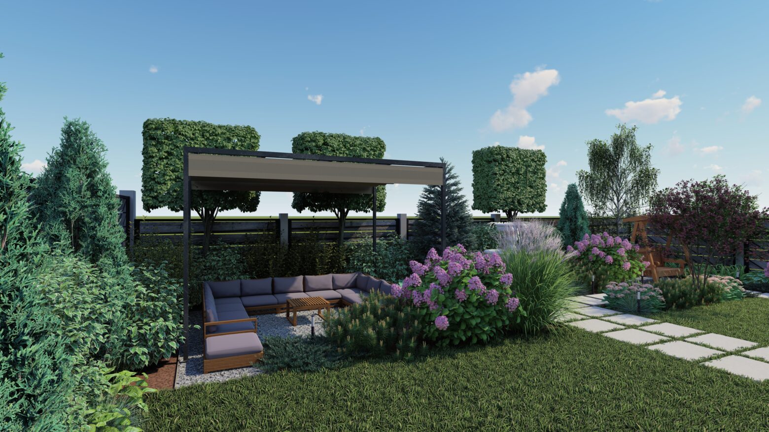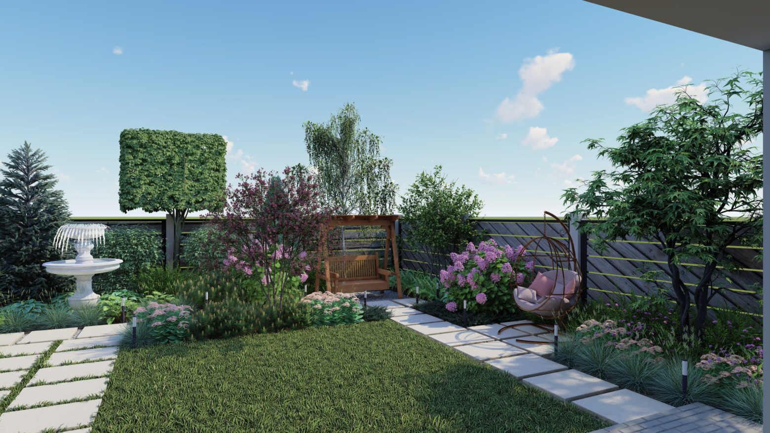 În această grădină, liniile drepte nu impun, ci ghidează. Compoziția geometrică creează un ritm calm, în care fiecare alee, fiecare colț verde și fiecare spațiu de repaus își găsește locul firesc. Structura nu aduce rigiditate, ci deschide drumul către mici refugii de liniște, conturate delicat de vegetație.