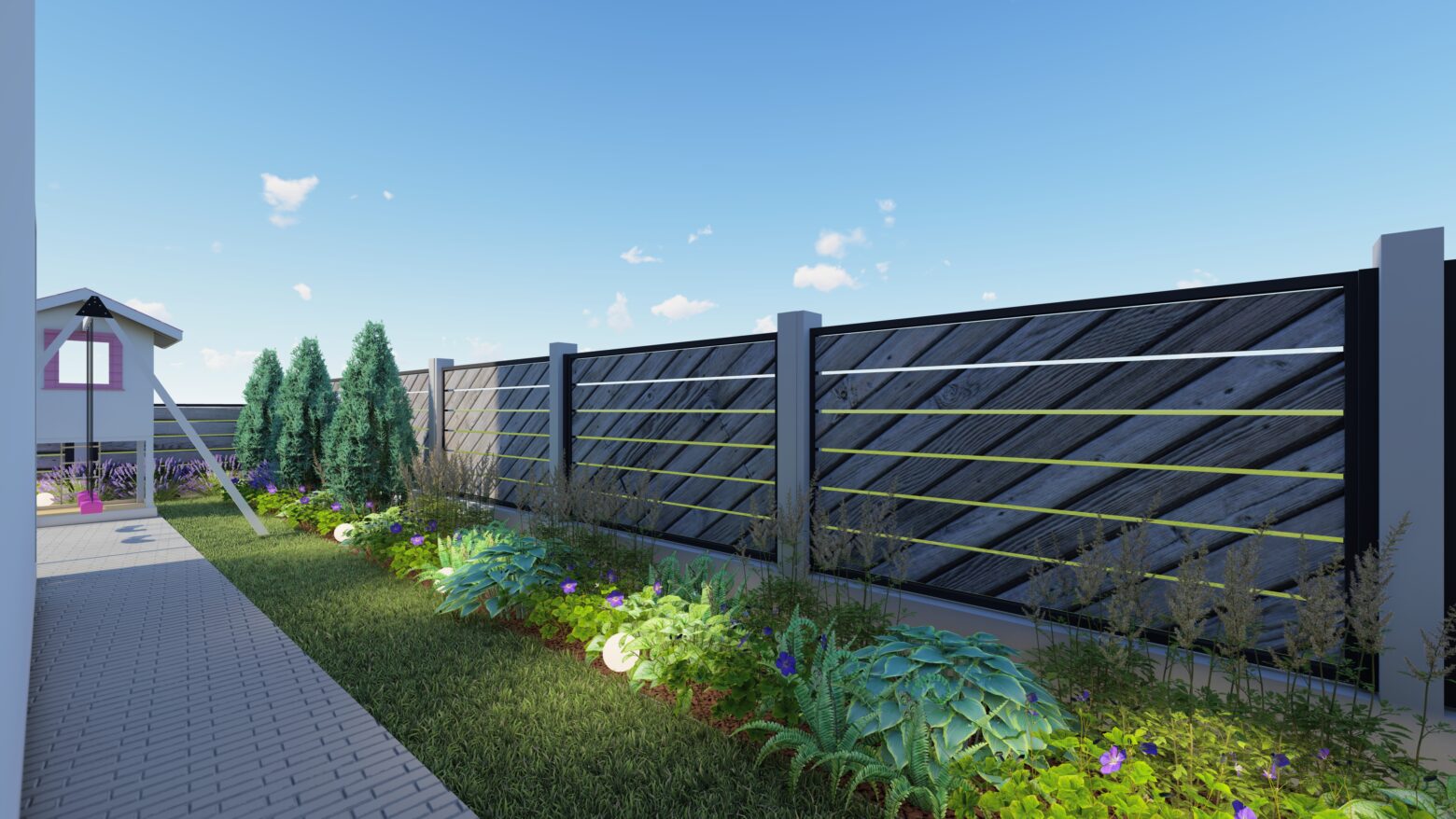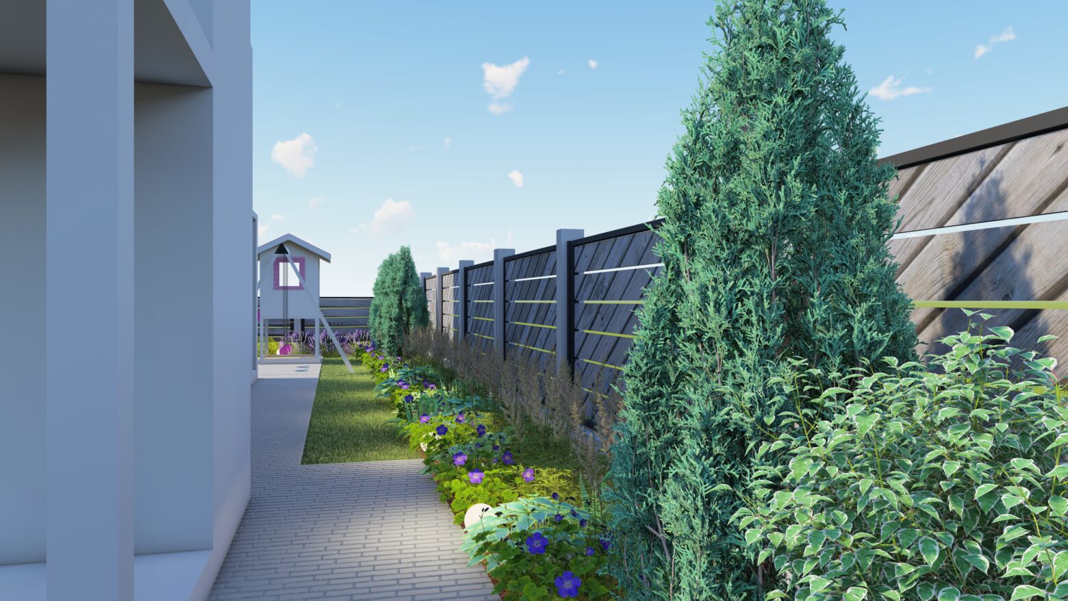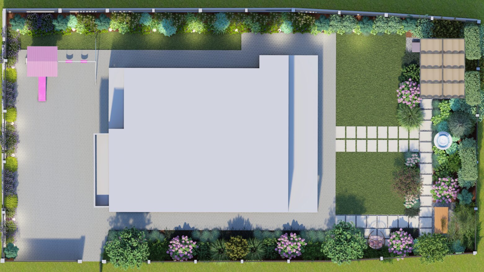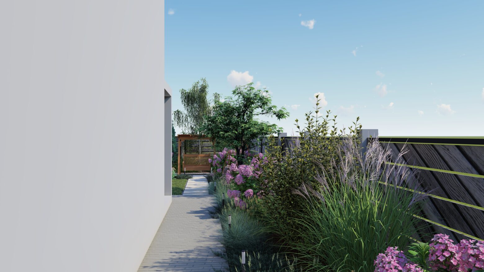În această grădină, liniile drepte nu impun, ci ghidează. Compoziția geometrică creează un ritm calm, în care fiecare alee, fiecare colț verde și fiecare spațiu de repaus își găsește locul firesc. Structura nu aduce rigiditate, ci deschide drumul către mici refugii de liniște, conturate delicat de vegetație.
